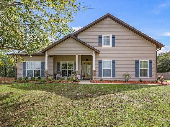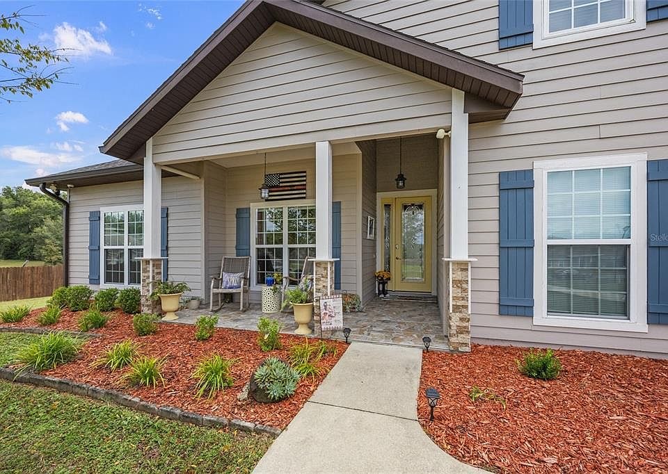 This beautiful 3 bedroom, 2 bathroom home with office and upstairs bonus room offers over 2,359 SF of thoughtfully designed living space, situated on a private 1+ acre lot with a wooded backdrop. From the moment you arrive, you’ll notice the upgraded finishes and the open, airy floor plan that make this home perfect for both everyday living and entertaining. The heart of the home is the spacious kitchen, complete with granite countertops, island with breakfast bar, and a seamless flow into the dining and great room. Wood floors and tile extend throughout most of the downstairs, creating both elegance and durability. The upstairs landing provides a charming sitting nook, and the oversized bonus room (approx. 22’ x 18’) offers endless flexibility. The primary suite is a true retreat, featuring a dream-worthy walk-in closet, dual granite vanities, a Jacuzzi tub, and a large shower with dual showerheads. The additional bedrooms and office provide plenty of room for family and guests. Step outside to your backyard oasis—an expanded screened porch with a covered sitting area overlooks the sparkling saltwater pool. The fenced yard features a newly added patio with outdoor fire pit, and plenty of open space for play or relax and enjoy stunning sunsets. This property backs up to large Kanapaha prairie preserve with lots of wildlife. The backyard shed includes electricity, and the home is equipped with a generator hookup for peace of mind. This home offers the perfect blend of privacy, luxury, and convenience within a gorgeous neighborhood featuring many recreation features, including playground, hiking trails through woods, as well as a paved walking trail.
