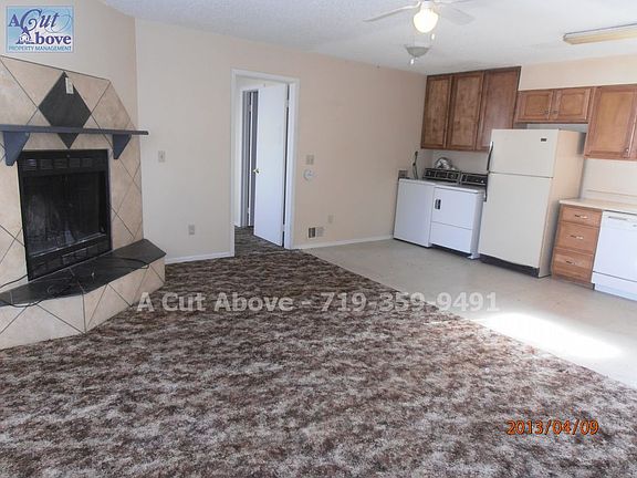 This 950 square foot upper apartment unit has 2 bedroom with 2 full baths. Wood burning fireplace, all kitchen appliances, new carpet and washer and dryer. Call today to come take a look 719-359-9491