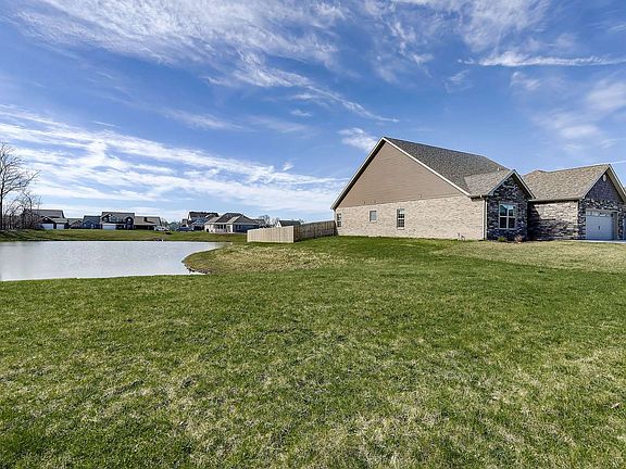 One year new! All brick home nestled aside a stocked fishing pond in the Frederick Farms Subdivision. Featuring three bedrooms, two full baths, a large open concept living/kitchen/dining space with a cathedral ceiling, and 13x28 sunroom with corner gas fireplace, the kitchen has a raised bar top, quartz countertops, pantry, stainless steel appliances and both gas and electric hook ups for the range. The master bedroom also offers a cathedral ceiling, large walk-in closet, tiled shower, corner garden tub and two vanities. Three car garage, privacy fenced in yard, complete with fire pit and playset make this the perfect space to call home!