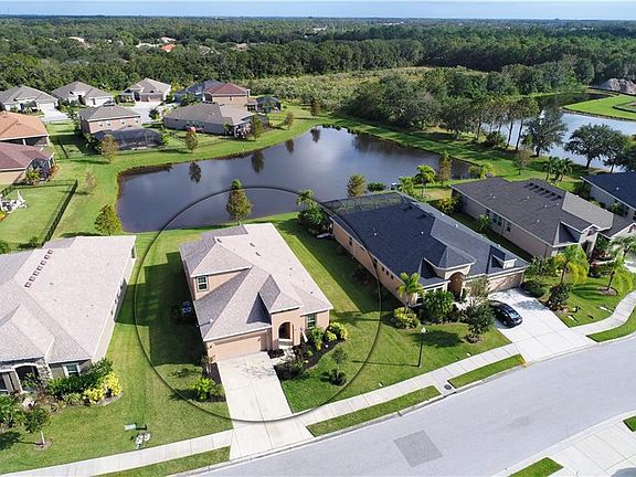 Beautiful home in a great community. This three bedroom three bathroom home also has a large den with wood flooring and a large bonus room upstairs with its own full bathroom and walk-in closet. Currently the den is being used as a fourth bedroom, and the bonus room is being used as an office and media room. There is also an additional space between the second and third bedrooms that can be used as a play area, media space, or exercise area. Lots of options with this home. Upstairs could even be a 2nd master. The upgrades include stainless appliances, solid wood cabinets, granite counters and tankless water heater. Tile flooring throughout the first floor living spaces. The French doors lead to a large covered and screened lanai overlooking a large yard and picturesque lake. Plenty of room to add a pool. Otherwise, this gated community already has two great pools, playgrounds, tennis courts, basketball court, fitness center, soccer field, baseball field, and fishing pier. This community offers something for everyone. Look at the virtual tour to see additional pictures.