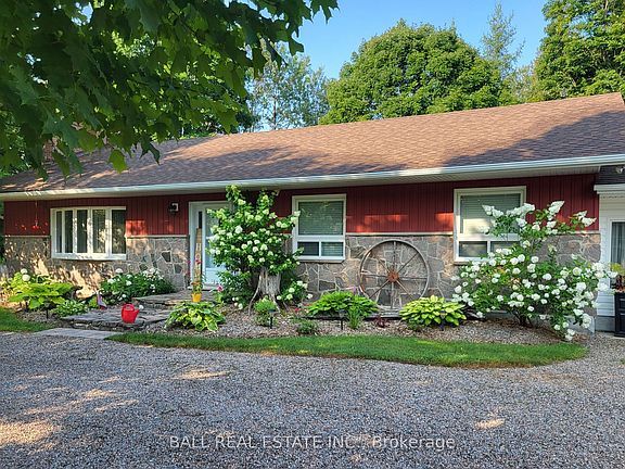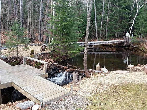 Extensively and beautifully renovated 3 bedroom - 2 bathroom home in the heart of cottage country is not to be missed. This ranch style beauty has a long list of upgrades and features including open concept kitchen-dining-living room, propane kitchen stove, attractive cupboards and granite counter tops. High quality fixtures throughout, a spacious and bright primary bedroom with 3 piece ensuite, 2 spare bedrooms and a 4 piece main bathroom all on the main floor. The office with separate entrance could be used for a home based business or a handy mud room with access from the attached 1.5 car garage. The large 1.39 acre lot with 347 feet of frontage offers great privacy and is beautifully landscaped with gardens, a deck for entertaining, a flowing creek and two ponds with four waterfalls! The large pond is swimmable with 6 feet depth off the dock, and a small beach. Other fine features include forced air propane heat with central air conditioner, impressive stone fireplace with efficient air tight woodstove insert, Generac standby generator, attached garage plus a detached 17'x30' shop for all the tools and toys! A short walk to the grocery store, LCBO, gift store, restaurant, curling club, new municipal park and beach! A short drive takes you to the boat launch and beach on Wilbermere Lake. Under 30 minutes gets you to Haliburton Village or 35 minutes to the Town of Bancroft for shopping and services.