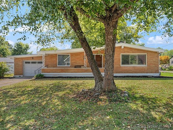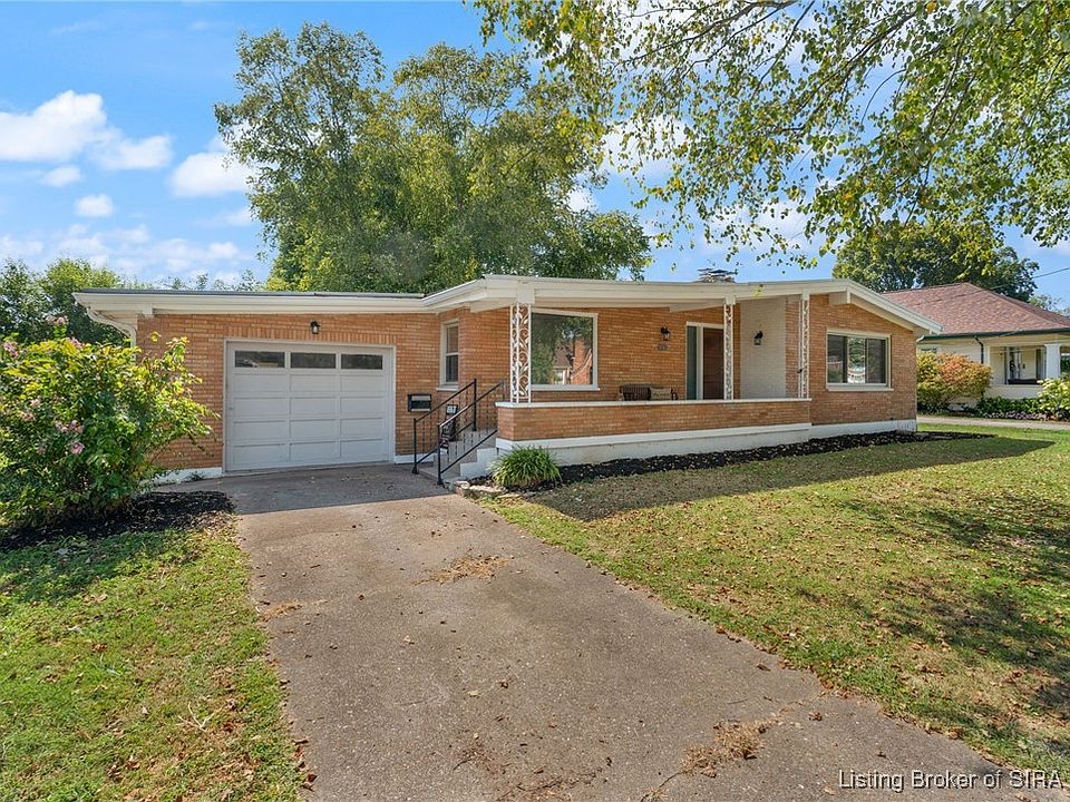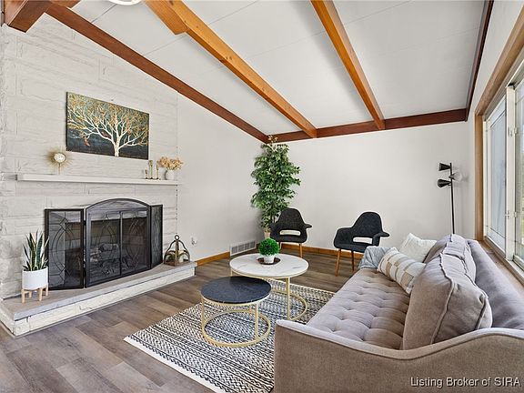 Welcome to your charming NEWLY renovated brick ranch home! This home's vaulted ceiling with natural wooden beams and bright natural lighting impress from the moment you walk through the door. It features 2 decorative fireplaces, NEW LVP flooring everywhere but bedrooms, which have NEW carpet, AND completely remodeled kitchen and bathroom. Enjoy your screened in back porch while enjoying your beautiful back yard. Plus, the full unfinished basement, accessible entirely from the outside in screened porch, provides ample storage space or the potential for future expansion. In November, the rolled shingle roof was recoated with a silicone sealant which is a lifetime guaranteed product. Located on a spacious, shaded lot on a quiet street between Lewis & Clark Pkwy, Clarksville and Spring Street, New Albany, this cozy home is close to everything! Come see this home and make it yours today!