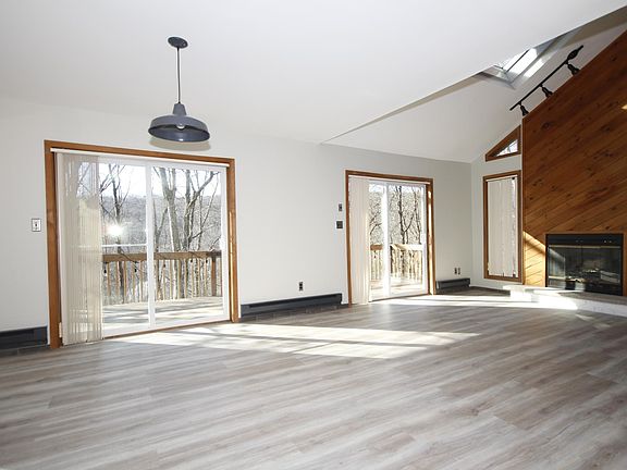The living area features a beautiful wood paneled wall and a working wood burning fireplace. Extra tall ceilings, skylight, luxury vinyl flooring, European tile base molding, 3 sliding glass doors leading to a massive deck and a screened in porch.