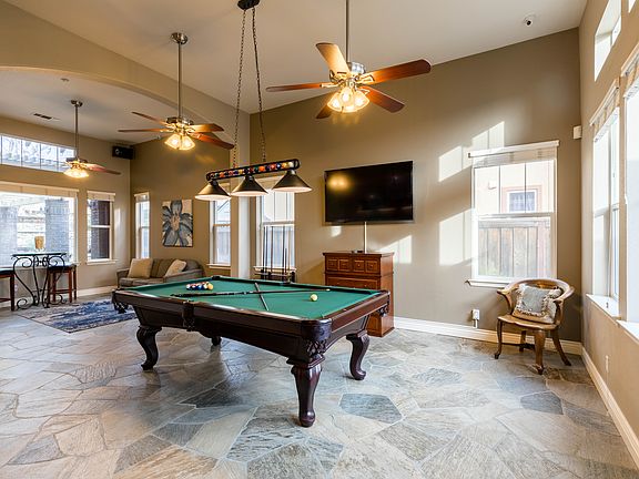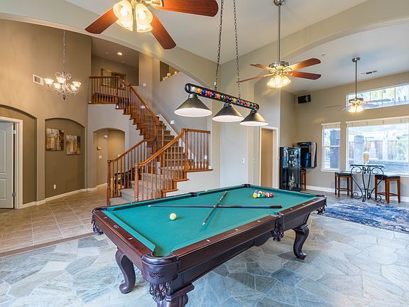 Beautiful home with spacious three-car garage. Open floor plan with an inviting foyer with high vaulted ceilings. Living room has upgraded sandstone flooring, large, bright windows, and multiple ceiling fans. Large kitchen with butler's pantry, tile floors, granite countertop, new tile backsplash, and way too many upgrades to list. Family room comes with a gas fireplace, integrated entertainment unit, views of the backyard, ceiling fan, and tile floors. Full laundry room with cabinets for storage and a half bath. Upstairs living quarters include a large master bedroom. Master bathroom features his & her vanity, built-in makeup vanity, large master closet, sunken jetted tub, and a large shower with spa seating and tile bath walls. The hallway bathroom has a large double vanity, tile floors, and shower-tub combo. Backyard with pool, hot tub, firepit, outdoor kitchen, custom-built bar, covered patio, and dog run. Pool table + access. and patio cover negotiable with sale.