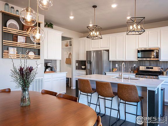 Beautiful, semi-custom home with upgrades from original build in 2020! Master suite has mountain views! This home features a finished basement with a bedroom, full bath, communal space, and finished storage closet. The light-filled, main floor has authentic hardwood flooring, Bali wood blinds, mud room with shelving, custom kitchen shelving, office, and a first floor bathroom remodel. The home comes with solar powered ring cameras, updated light fixtures and a reverse osmosis water filtration system in kitchen. Upstairs you will find a bathroom remodel, new tile in the laundry room and master bath, a loft and 3 bedrooms. Outside, there is fenced, landscaped yard, sprinkler system, and concrete patio. The neighborhood abuts the Longmont Rec Center, museum, walking paths, and is close to the new Costco. Zoned for St. Vrain Valley schools including Sunset Middle and Niwot High School! This semi-custom, custom home is a gem in the community.