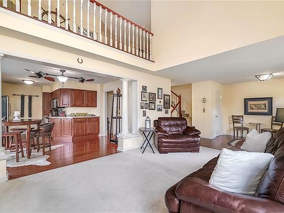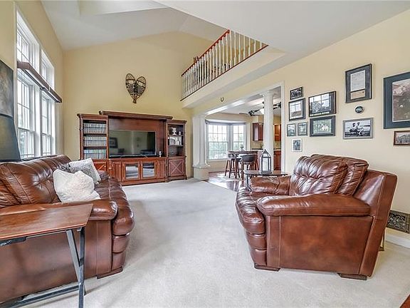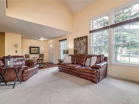 STATELY 4 BEDROOM END UNIT TOWNHOME WITH 1st FLOOR MASTER. A vaulted living room and hardwood floors welcome you. Striking columns lead you to the open dining room/kitchen area accented by rich wood cabinetry, stainless appliances and a walk-in bay window area. A double door invites you in to the 1st floor master suite with private bath featuring a large soaking tub, separate shower, and double vanity. The suite also has French doors to a balcony with wooded views. Upstairs you'll find 3 nicely sized bedrooms, large neutral bath with double vanity, convenient laundry room PLUS bonus 21' loft den area - great for home office or relaxing. The walk-out lower level provides a full game room area just about complete with new carpet. There's an additional room great for storage or even an additional laundry room. The 2 car garage is high enough to accommodate most high profile vehicles. Double driveway and convenient visitor parking. Easy access to Rt 19, 79 and Southpoint.