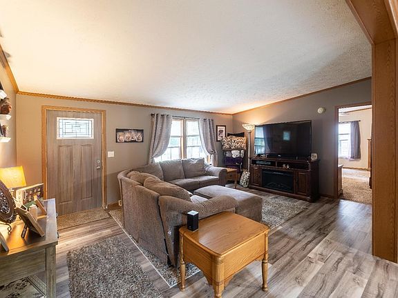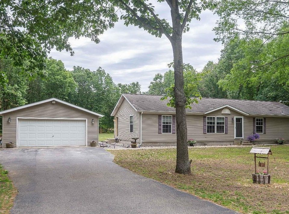 Move in Ready, This 3bed, 2 bath, 1500+ sqft floor plan offers not only a generous living room right through the front entry, but an additional spacious living room with a stacked stone front fireplace! Home is highly coveted open concept with living space, kitchen and dining all open for maximum entertaining. From the dining room through sliding doors, there is a large rear deck - great for BBQ's and enjoying your secluded country setting on a 1 acre lot! The split floor plan has bedroom 2 & 3 on one end with their own full bath. While the master suite offers a big walk in closet & spacious master bath with a corner garden tub as well as a separate shower. The interior boasts many updates including flooring throughout much of the home. Appliances stay, new in 2018. Outside you'll find a 22 x 22 detached garage for the toys & paved driveway! Close to 49 for easy commute.