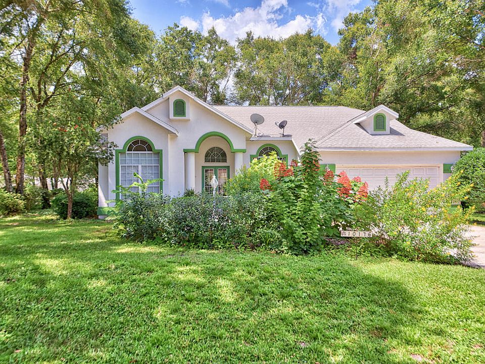 This home is light and airy, with spectacular volume ceilings throughout. Open concept kitchen flows to family room and casual eating nook. The Foyer, L.R. and D.R. is impressive with high windows. Split plan with master and en suite bath with large walk in shower and separate tub are on one side of home, with guest side on other with 2 BD and shared bath. The garage is oversized at 525'. A large covered lanai and screen room has lots of seating and a hot tub overlooking the well maintained yard. The interior laundry room has nice storage. Come enjoy nature with our private residents park on the river with beach, kayak launch and pavilions.The Community Center was just approved and will host many amenities beginning in 2019.Low HOA will be $230 Annually.