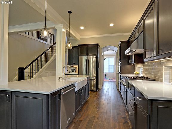 2017 built, move-in-ready home w/Washington County Taxes. 4 beds(1 on main), 3 baths + family or den. Gourmet kitchen/living/nook great room w/butler's pantry, farmhouse sink & island/eat bar. Partially covered back patio overlooking all-weather & easy maintenance turf lawn + putting green. Quality amenities: hardwoods on main, custom built-ins, columns & wainscoting. Primary bedroom w/walk-in closet, tray ceiling, built-ins, double vanity & separate soak tub. 15 min drive to downtown Portland.