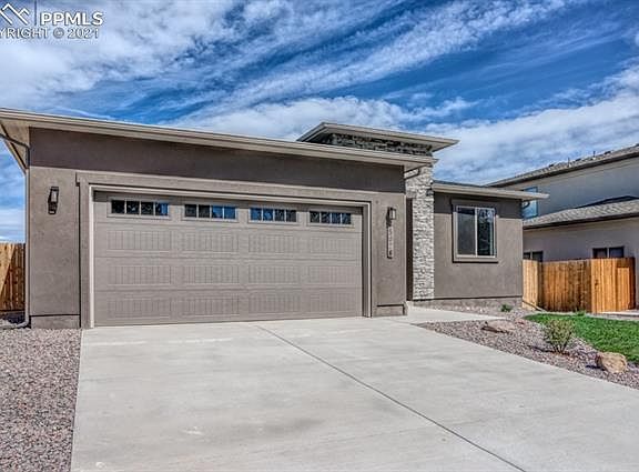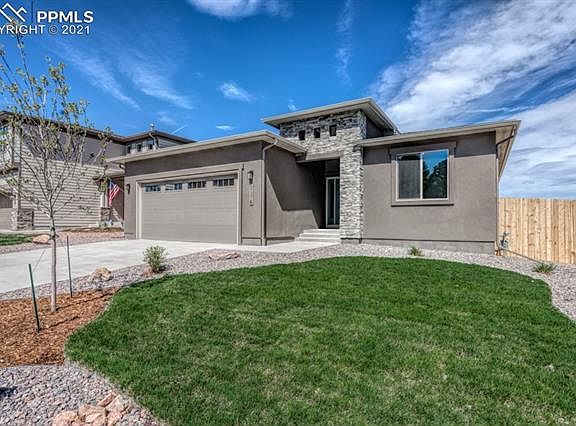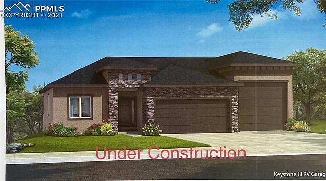 This is a brand new Ranch style home with huge RV garage in Paint Brush Hills. The main level offers a large Master bedroom with coffered ceilings and attached private Master bath with huge shower, ceramic tile and solid surface counter tops. Attached is the huge walk-in closet. Very open kitchen with large dining area. All soft close cabinetry, recessed lighting, solid surface counters and stainless steel appliances. Enjoy the open living room with a beautiful fireplace and walk-out to the patio with incredible views of Pikes Peak. There are 2 additional bedrooms on the main level. The fully finished garden level basement with 9 ft ceilings features 2 additional bedrooms and a full bathroom. The large rec. room has all the space you need for entertaining your family and guests including a wet bar. Bring all your toys as the huge 3 car garage and additional RV Garage offers plenty of space. This home has an estimated completion date of 08/31/21.
