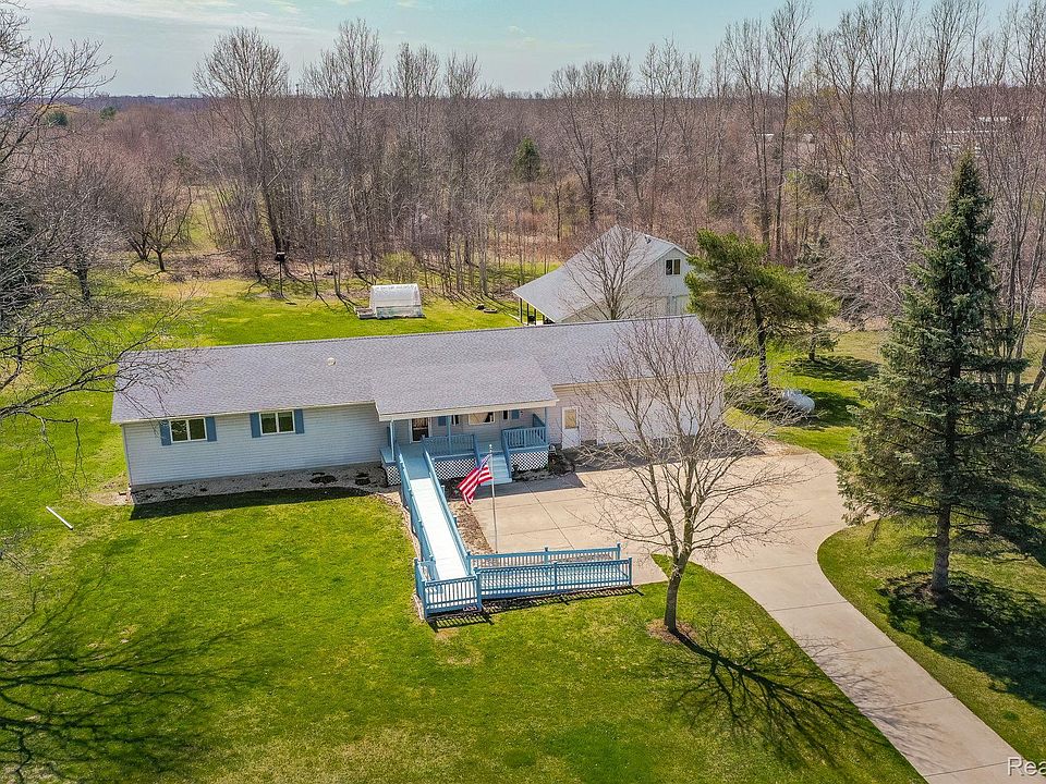 Ample 10 acres with trails to the back creek. 30x40 drive through Pole Barn with 3 garage doors, expansive loft, covered patio space and pellet stove and new roof 2024. Property also has a hunting blind, greenhouse and stand-alone structure. Handicap accessible ramp into house if needed, wide halls, doors, and basement stairs. Brand new hickory flooring throughout living areas and new carpeting in the bedrooms. New interior doors and trim. Impressive Primary bath with brand new XL tile and gorgeous dual blue vanity to pull the whole room together with a walk-in shower and closet. Main bath recently updated as well. Kitchen features an island, granite countertops, all stainless-steel appliances including dishwasher and gas stove w oven. 1st floor laundry washer and dryer included. Mud room entry with half bath off the extra deep 2 car attached garage. Full basement, partially finished with lots of storage. Geothermal heating and cooling, brand new water heater, whole house Generac generator, new roof 2024