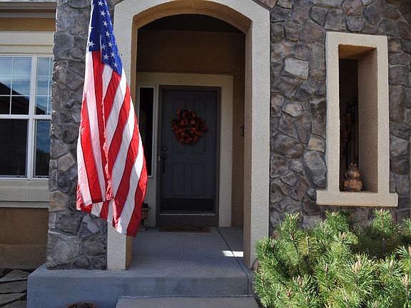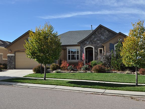 True main level living at it's finest! This beautiful ranch style home features 4 beds, 4 baths and a 3 car tandem garage. Built by one of the areas most respected builders you can rest assured that this home was built well! The open floor plan boasts a gourmet kitchen with granite counters, in wall oven, built in microwave, a walk in pantry, upgraded cabinetry w/crown molding and extensive hardwood flooring. The adjoining Breakfast nook has a comfortable window seat and extended cabinets for added storage space. Take in the sweeping views from the great room while you surround yourself with the custom paint, stylish window coverings, a gas burning fireplace, built in TV niche, hardwood flooring and whole house audio. The main level study is perfect for the stay home professional or use the space as a formal dining room, your options are endless. Step into your private master suite where you will be spoiled by the views of Pikes Peak, the front range and The Air Force Academy from your sitting area. A 5 pc. bath where you can relax in a hot bubble bath in your oval soaking tub. Step out to the trex deck from your suite and enjoy your morning coffee or watch the stars at night. A second master suite is located on the main level. This room will be perfect for guests with it's own full bath, sitting area and generous sized walk in closet. Make your way to the fully finished walk out basement. Surround sound makes for a great family movie night. Stay cozy with the gas burning fireplace. There's even room for a future wet bar! Two large bedrooms with walk in closets and a full bath complete the basement. Enjoy the outdoors from the main level trex deck or the lower level stamped concrete patio. Sweeping mountain views, central air, whole house audio and much more!