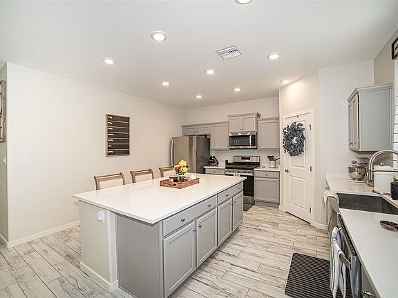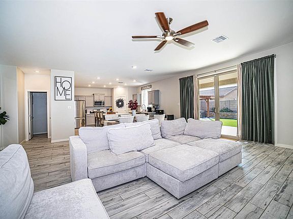 Modern luxury meets comfort and convenience. Nestled in the Estrella at Mesa Del Sol Subdivision, this 3-bedroom, 2.5 bath home boasts wood-like tile flooring in traffic areas and plush upgraded carpeting in the bedrooms. The oversized glass doors in the living room provide tons of light and a perfect view into a polished relaxing yard. A gourmet kitchen with white quartz countertops and a large eat-in island seamlessly connects the living room, dining area and kitchen, making it ideal for entertaining.