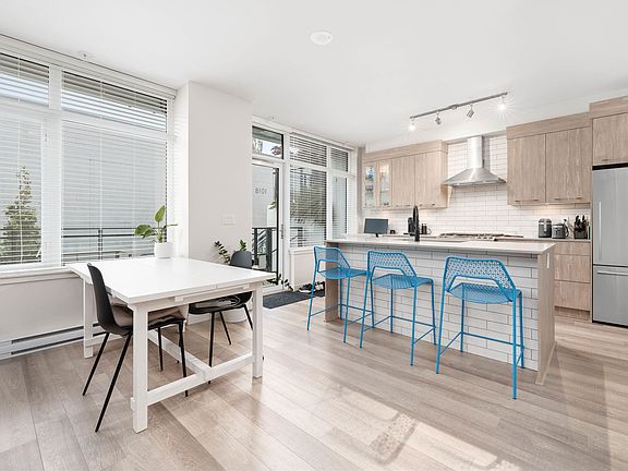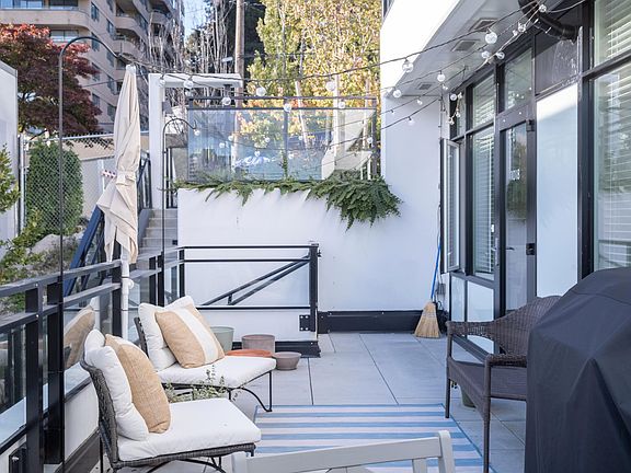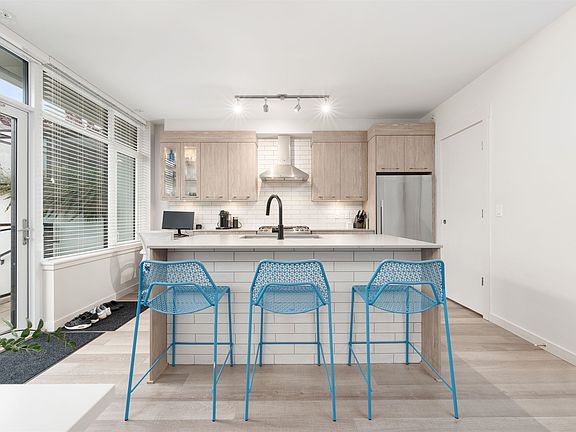 Stunning 1,340 square foot CORNER 3 bedroom 2.5 bathroom concrete townhome at Capitol by Porte! Your main level offers a spacious open concept kitchen, living & dining room equipped with large walk-in pantry, mudroom with built in storage, & private powder room. Your ground level living features 9' ceilings, modern laminate flooring, S/S appliance package with full size Fisher Paykal refrigerator & loads of storage! From the kitchen, you will enjoy your private SW facing 295 sq ft patio equipped with gas bib. The custom glass and stainless steel railing to your second floor adds even more luxury to this gorgeous home. Upstairs includes 3 bedrooms with peek-a-boo city and water views! Easy access to your 2 parking stalls & large storage room directly outside mudroom.