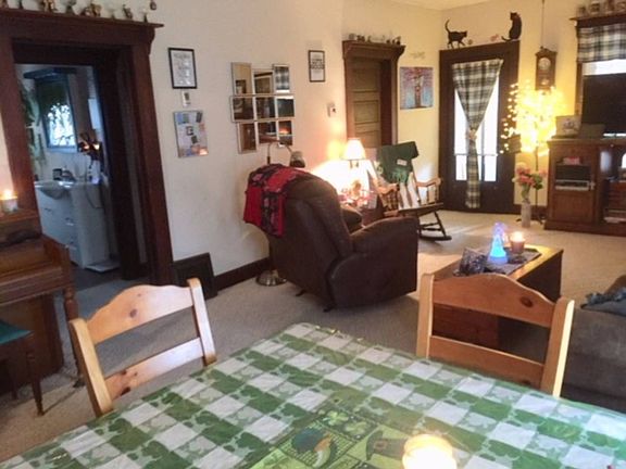 Classic Bungalow on Corner Lot Entrance: Glass enclosed front porch Living Rm/ Dining Rm: Large open combination room with painted walls, berber carpet, dark wood trim with shelves over the windows Hardwood under carpet Kitchen: Birch cabinets, white counter top, appliances included Bath: New Lavatory and Commode, Tub/Shower combination 1st Bedroom: Large Room holds a king size bed, Walk-in closet 2nd Bedroom: Has two closets Basement: Has shower in basement, GFA/CAC, Breakers, Lots of Storage plus built in Shelves, Closet and a wine cellar under front porch Breeze Way: Connects garage and house in back New Roof: On breezeway and garage roof Double Hung Windows 2007 Fenced-in Yard and Paved Driveway