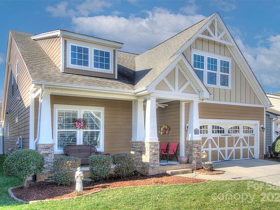 Seller has received multiple offers- no further showings. This beautifully maintained Craftsman-style home with lawn maintenance included seamlessly blends the ease of ranch-style living with the added versatility of an upstairs bonus/bedroom space. The open-concept main level features a stunning kitchen with granite countertops, upgraded appliances, a pantry, and a spacious island with bar seating. The breakfast area overlooks a covered patio and a beautifully landscaped backyard, while a separate formal dining room provides ample space for entertaining guests. Primary suite on main with a trey ceiling, owners bath with raised vanity, separate tub and tiled shower with a spacious closet. The inviting family room boasts a cozy fireplace with gas logs. Bedroom 2 on main level (currently office) with full bathroom. Upstairs you'll find a large bedroom 4/bonus room dual closets/ third full bathroom and bedroom. Plantation shutters through the main level.