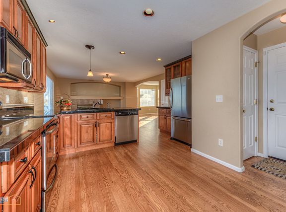 Wonderful 3 bedroom plus loft home with 180 degree views to the east! Spacious entry area. Upgraded cherry cabinets in kitchen with granite counters, stainless steel appliances and breakfast nook. Beautiful built-in hutch in dinning area. Large master suite with views of Longs Peak. Master bath has tile counter and floor, shower, soaking tub, and walk in closet. Wonderful upstairs loft with lots of windows and light. Open stair railing. Large composite deck with metal railings. Unfinished walkout basement with rough in plumbing for a bathroom. Nice fenced backyard. Over sized garage with lots of storage. Community park and trails just down the street. Ready to move in now! New exterior paint summer 2016