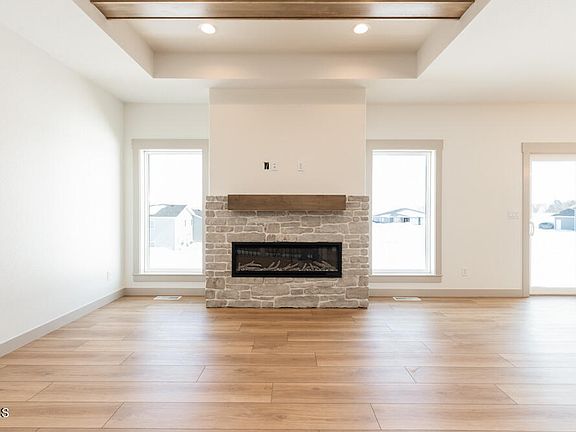 This ranch style home is a must see! The home features an open main floor concept with three bedrooms and two full bathrooms. The great room has a trayed ceiling with beams and gas fireplace. Adjacent to the great room is the kitchen and dining room. The kitchen features a large center island, quartz countertops, soft close cabinetry, tile backsplash, black stainless steel appliances, and a pantry. The dining room has a sliding glass door that opens up to spectacular view of Bismarck! One of the three bedrooms on the main, is the master suite which features a trayed ceiling, walk in closet, double sink vanity, and a tiled shower. The unfinished basement has the possibility of two bedrooms, one bathroom, a bonus room, and family room. The fully finished garage has floor drains, heater, and is plumbed for h/c water hookup. Other features of the home include bench and hooks, main floor laundry room, Pella windows, and stone on front exterior. Taxes and specials are incomplete. Buyers agent to verify.