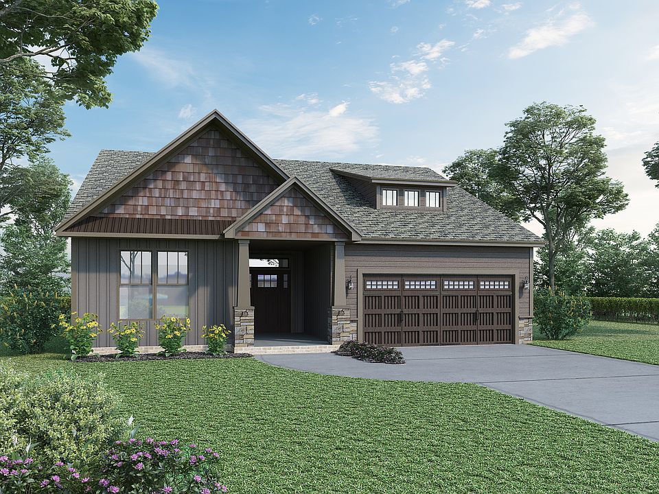 The Cameron's large foyer leads to the secondary bedrooms on one side and the garage and bonus room on the other. Moving forward, the foyer angles into the large, open living space comprising the kitchen, dining area, and family room. The family room has a cathedral ceiling, which creates a degree of distinction between the three open spaces within this plan.Located just off the dining room, an angled French door opens out into the covered patio?creating opportunities for outdoor dining. A short hallway branches off the family room, and leads to both the laundry room and the master suite. Near the foyer, a full downstairs bathroom serves both secondary bedrooms, as well as any guests.
