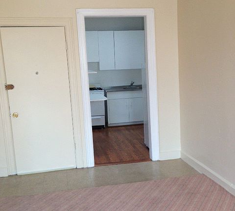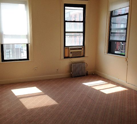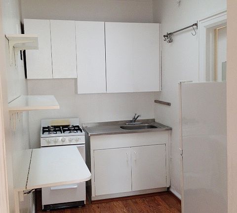 2 rooms, kitchen and large bedroom, large closet, high ceilings, skylight, Very Sunny apartment. Rug is not glued down previous tenet left it, Tile underneath. Heat and hot water included.