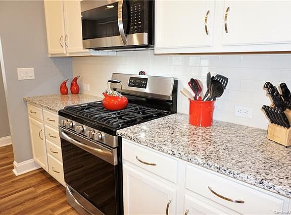 Immaculately maintained and designed with attention to detail, this beautiful turn key ranch home features an open floor plan, bright white kitchen w/ stainless steel appls, oversized granite island w/ seating, white subway tile backsplash, upgraded gas range, open dining area, cozy living room w/ gas fireplace, triple windows & accent lighting, master w/ bay window, trey ceiling & walk-in closet, master bath w/ granite counters, double vanity & large shower w/ tile & glass surround, wainscoting & crown molding in entry hall, drop zone off garage, tile & granite in all baths, sliding doors to covered patio and Energy Star Certified. Upgrades include custom paint, blinds, appliances, lighting, ceiling fans, landscaping & alarm system. The quaint community with pool and playground is located conveniently to shopping, restaurants, entertainment and I485. TAEXX Internal Pest Defense System. Washer, dryer & refrigerator remain w/ acceptable offer.