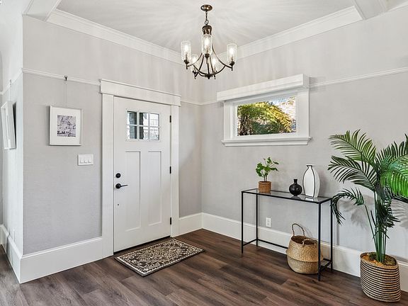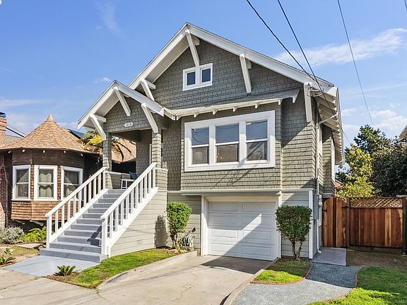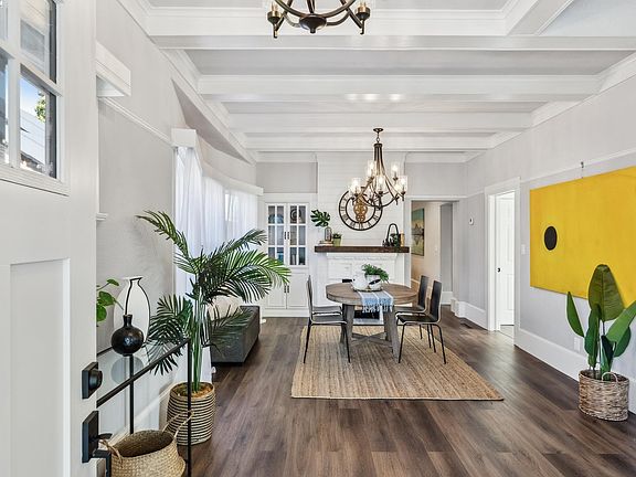 Step into this beautifully updated 1905 early Craftsman, blending historic charm with modern comforts! The chic and stylish kitchen boasts quartz countertops, a spacious island with a wine fridge, fire clay backsplash tiles, stainless steel appliances, custom tile work above the gas range oven, recessed ceiling lights, floating shelves and striking pendant lighting. Fresh two-tone paint enhances the living and dining rooms, featuring coved and box beam ceilings with picture railings. The spacious foyer and dining room have large matching chandeliers. Waterproof, scratch-resistant luxury vinyl plank flooring flows throughout. Updated electrical and copper plumbing ensure easy home insurance while the many dual pane windows provide sound and energy efficiency. The main level offers two large and two junior bedrooms with a hallway bath, while downstairs, kitchenette, pantry, bonus rooms and a full bath open to a landscaped yard. Just one block from Park Street’s vibrant restaurants, cafes, shops, South Shore Shopping Center, the beach, and near Alameda High!