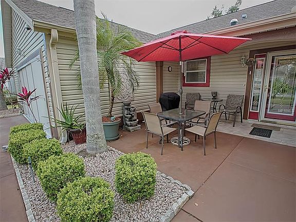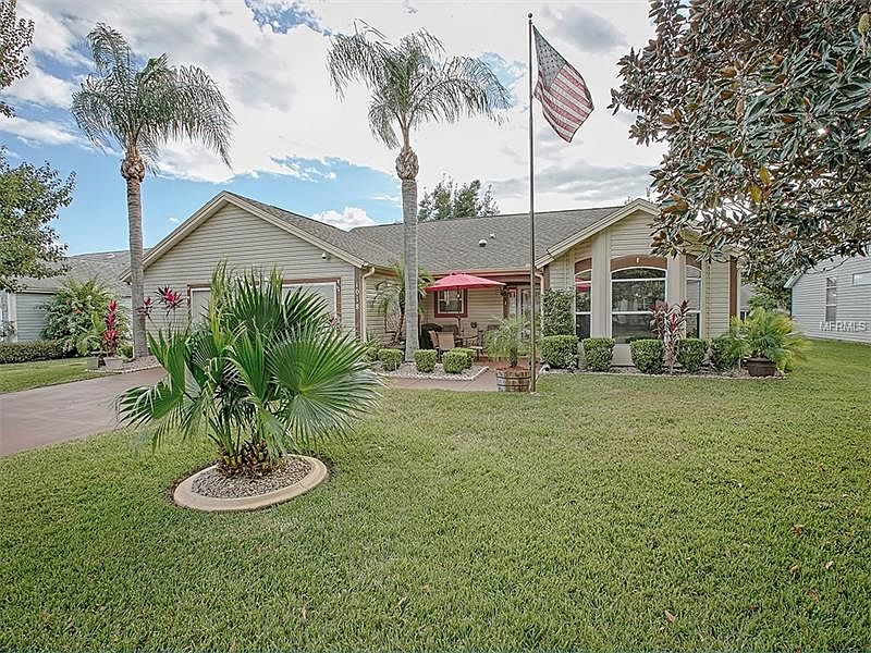BOND IS PAID and GOLF CART INCLUDED with this LOVELY 3/2 CYPRESS Designer in the Village of HACIENDA! As you approach the home, you'll find one of the best seats in the house - relaxing on the expanded patio and front porch. And as you enter through the LEADED front door you'll begin to appreciate all of the upgrades throughout the entire home. There is DIAGONAL TILE throughout only excluding the 2nd guest room. The kitchen has GRANITE, all upgraded and nearly new appliances with a smooth top and convection oven, upper and lower pullouts, breakfast bar with pendant lighting, eat in area, a built in desk, lots of extra storage space and a pantry! There is wainscoting in the kitchen nook and a bay window! The living room opens with sliding glass doors to the enclosed lanai. Outdoors there is an open patio and birdcage which provides shade with 2 gazebo canopies. The master bedroom has his and hers closets - the master bath has dual sinks, both master and guest have GRANITE and a new toilet! One guest room which does not have a closet is being used as a den which also opens with sliding glass doors out to the lanai. There are upgraded light fixtures throughout and a solar tube has been added in the living room. And wait until you see the garage! A full 7' stretch - a THREE CAR garage without the door but the space is still available inside! The HVAC was replaced in 2009 and there is a SOLAR water heater! Great location with Spanish Springs and the Hacienda Country Club right around the corner!