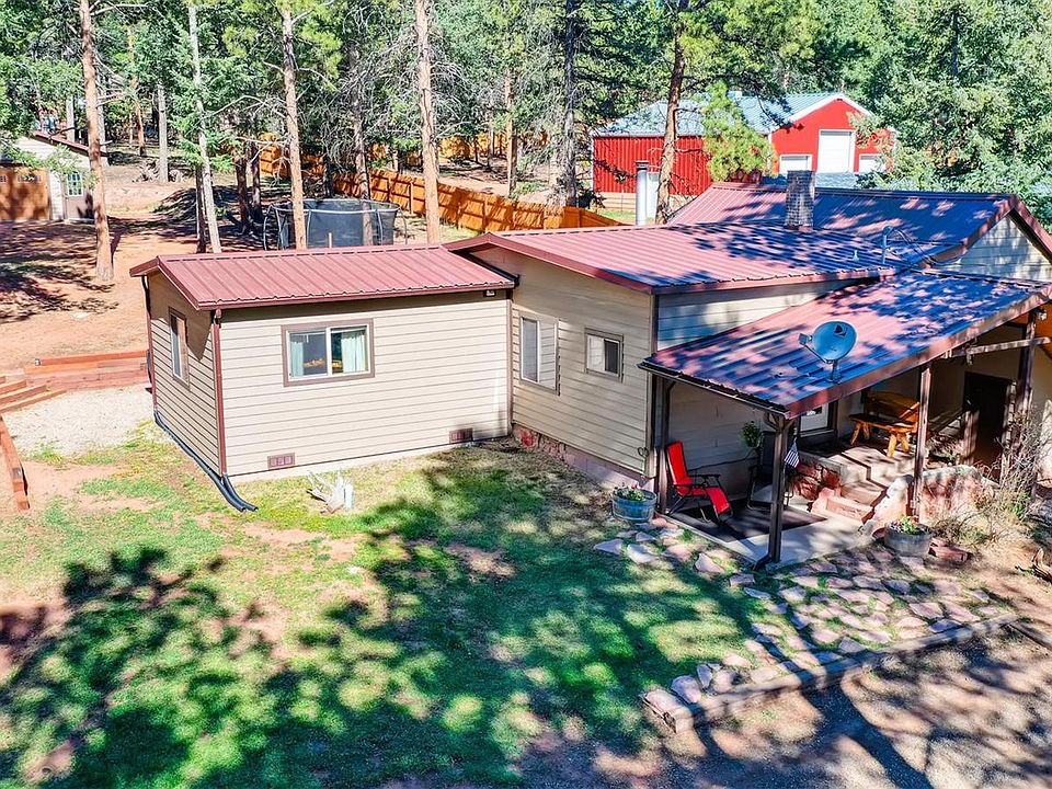Perfectly located within the town limits of Woodland Park and walking distance to downtown, this 3BR/2BA/2Car Oversized Garage Ranch style home sits on 0.81 wooded acre and is Move in Ready! Newly added family room with walkout to rear patio is great for hanging with friends or family, Master bedroom with gas log fireplace and adjoining full bath with beautiful custom built vanity, kitchen and dining with ceramic tile flooring, stainless steel appliances and Corian countertops, full bath with new tile flooring and vanity and spacious laundry/mudroom. Stay cozy on those chilly nights with the free-standing woodburning stove conveniently located in the spacious open layout. New pre-finished Masonite siding and metal roofing for years free of maintenance and vinyl windows throughout. Lots of outdoor living space included with a beautiful tongue and groove covered front patio and large gravel patio in the rear. 728 sq. ft. detached garage has plenty of workshop or ATV storage space. Enjoy the wildlife and privacy of more than ¾ of an acre but with the convenience of in town living.