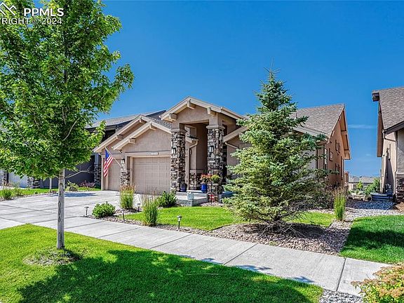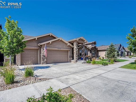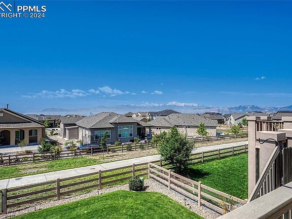 LIKE NEW, BEAUTIFUL STUCCO & STONE WALKOUT RANCH, VIEWS OF PIKES PEAK & MOUNTAINS & BACK TO CONCRETE WALKING TRAIL, ALL LANDSCAPING & CONCRETE FENCING DONE! EXTENDED 23 FOOT COMPOSITE DECK & HUGE 39X16’ STAMPED CONCRETE PATIO WITH PRIVACY, BUILT-IN STONE GAS LOG FIRE-PIT, OPEN FLOOR PLAN WITH HIGH VAULTED CEILINGS, RICH OAK HARDWOOD FLOORS ON MOST OF THE ENTIRE MAIN LEVEL, SPACIOUS GREAT ROOM, BUILT-INS & STONE GAS LOG FIREPLACE, BIG WINDOWS, LIGHT & VIEWS, OPEN GOURMET KITCHEN, RUSTIC WALNUT UPGRADED CABINETS, DOUBLE OVENS, ONE IS CONVECTION, 5 BURNER GAS COOKTOP, MICROWAVE, ALL STAINLESS APPLIANCES INCLUDING FRENCH DOOR REFRIGERATOR & NEW KITCHENAID DISHWASHER, MOVEMENT DESIGNER GRANITE, UNDER COUNTER LIGHTING, PENDANTS & CANS, 4 SMALL WINDOWS FOR NATURAL LIGHT ABOVE & BELOW CABINETS, PANTRY CLOSET, CRUMB CATCHER TO THE CENTRAL VACUUM SYSTEM, PRIMARY BEDROOM ALSO VAULTED, WOOD FLOORS & ARCH TO ADJOINING SITTING ROOM, 5-PIECE TILED BATH, LARGE RAIN GLASS SHOWER WITH SEAT, OVAL SOAKING TUB, WALK-IN CLOSET WITH ACCESS DIRECTLY TO THE LAUNDRY ROOM WITH UTILITY SINK, SECOND WOOD FLOOR BEDROOM & TILED BATH FULL BATH, GRANITE TOPS & TILE, DOWNSTAIRS LARGE FAMILY ROOM WITH BUILT-INS, ENTERTAINMENT AREA, 2 SPACIOUS BEDROOMS & FULL TILE BATH WITH GRANITE, ADDED INSULATION FOR SOUND IN THE 9 FOOT CEILINGS, OPEN STORAGE AREA COULD BE FUTURE EXPANSION, HI-EFFICIENCY FURNACE, RHEEM TANKLESS HOT WATER WITH RECIRCULATING PUMP, SECURITY SYSTEM WITH CAMERAS, LOCATED ON A GREAT WALKOUT LOT IN THE UPSCALE NEIGHBORHOOD OF WOLF RANCH NORTH, DON’T WAIT TO BUILD, HAVE YOUR DREAM HOME TODAY!