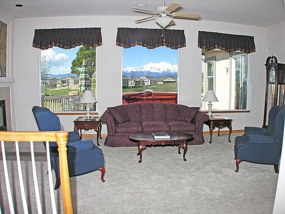 Backing to the 12th green in Pine Creek this beautiful ranch style home has great mountain Pikes Peak views Gourmet kitchen with new granite slab countertops and new stainless steel appliances Open bright floorplan with natural light through the wall of windows Formal living dining rooms Full finished basement with 9 ceilings a wet bar three additional bedrooms excess storage Enjoy the private setting golf course mountain views from the extended deck Other features include kitchen nook42 cabinets walkin pantry central air security system officestudy on the main level 5 piece master bath with a jetted tub 10main level ceilings dual furnaces two gas fireplaces main level laundry Two walkouts from the dining room master bedroom to the expansive deck Newer Roof 07 Fully fenced back yard Located between the 12th Green the 13th tee box Quick Access to District 20 Schools Shopping the Air Force Academy