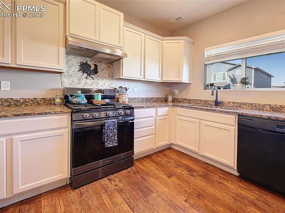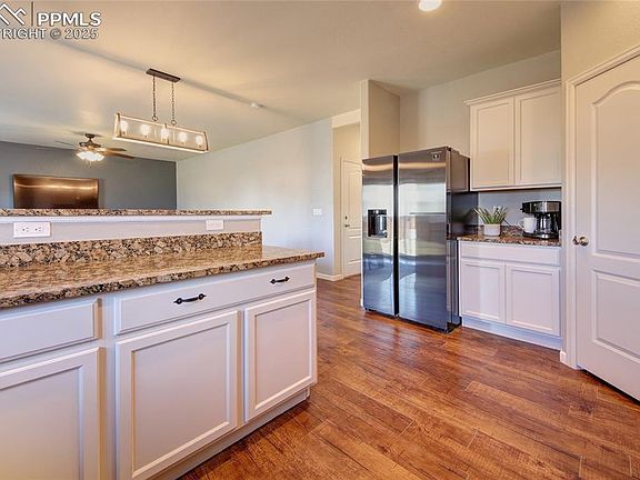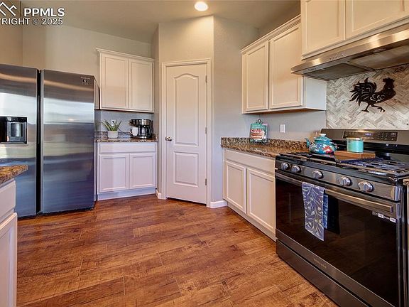 Come see this beautiful 2-story home in Lorson Ranch. It features an open floor plan with granite countertops, hardwood floors, and a spacious lot. The kitchen includes a gas range, a pantry, and new Samsung appliances added in 2022. The fridge in the garage stays. Recent updates include a new Class 4 roof and exterior paint in 2024. The home has a large laundry room, an attached 2-car garage, and a big unfinished basement for extra space or storage. Upstairs, you'll find a roomy master suite (14x15) with a large walk-in closet and double vanity, plus a spacious loft that can be used as a second living area or home office. The fully fenced backyard is perfect for pets, entertaining, or relaxing. Move-in ready with quick access to Fort Carson, Peterson AFB, and the Powers corridor.