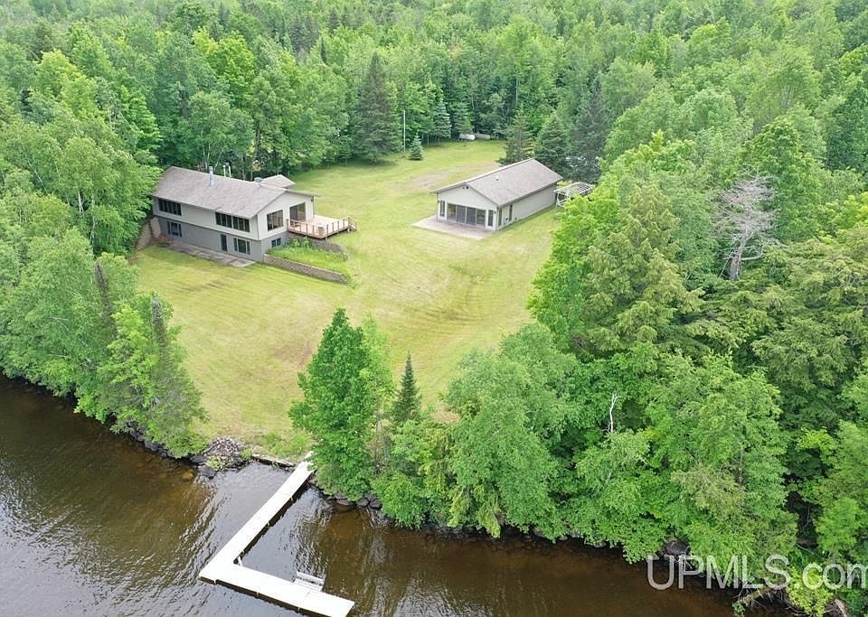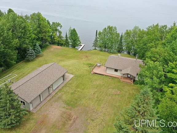 Very private fully furnished 3-bedroom, 2 bath ranch style home located on 200’ of Beautiful Lake Gogebic’s west shore. The home has recently been updated to include a new kitchen with Teak tongue and groove hardwood flooring, hickory cupboards, a new stove, refrigerator, microwave and dishwasher. In the living room you will find a wood burning fireplace, Teak hardwood flooring and new floor to ceiling wraparound Marvin windows offering a panoramic view of the morning sunrise and Lake Gogebic’s beauty. Down the hall is a full bathroom with a tiled shower, and a heated tile floor. Both upper bedrooms have tongue & groove hardwood flooring, plenty of closet space, and the master bedroom overlooks the lake. The lower level has a family room, bedroom, ½ bath, and walkout access to the back yard, lakeshore or dock and boatlift. The exterior of the home has recently been updated with HardiPlank siding and has a wraparound deck that you can enjoy your gorgeous view of the lake at any time of the day! The 2-car detached garage offers both storage and a Sun/Florida room. The sunroom features a sauna, full bath, wet bar with hickory cupboards, a decorative gas fireplace, hide-a-bed, and large patio windows allowing access to a cement patio area overlooking the lake. This property would be ideal for a year-round home or an income producing investment. This property won’t last long!! Call us for additional information and/or to schedule a showing! (2024 Tax Info: Txbl. Val.: $153,243, SEV: $287,922, Total Taxes: $7,583)