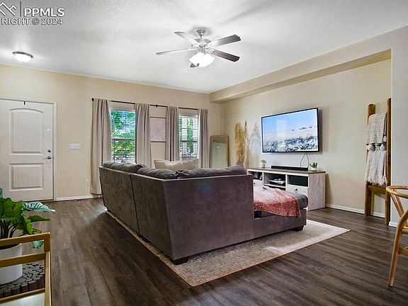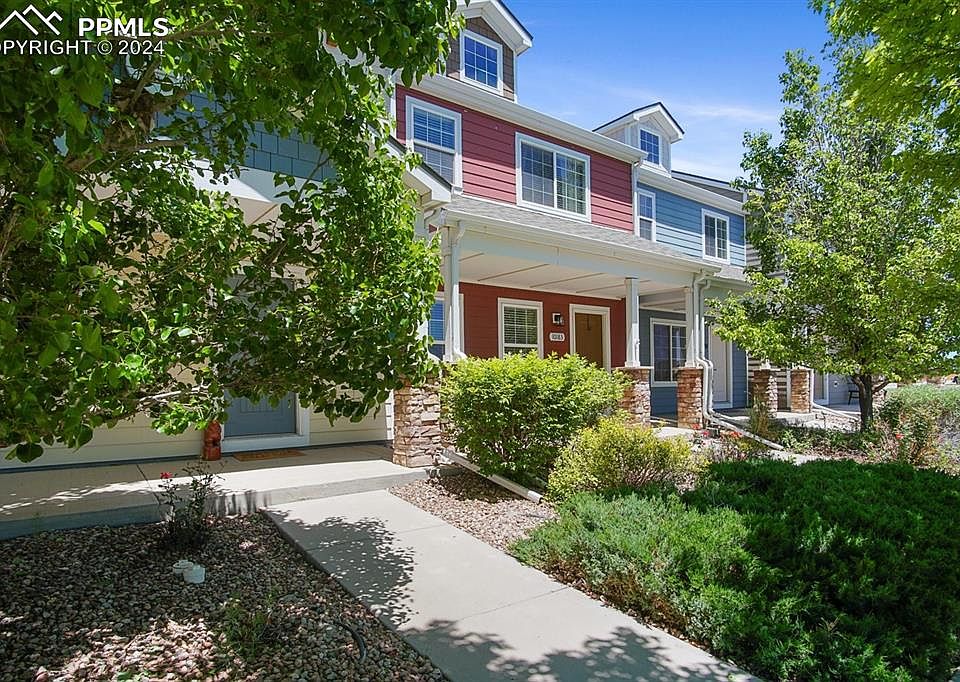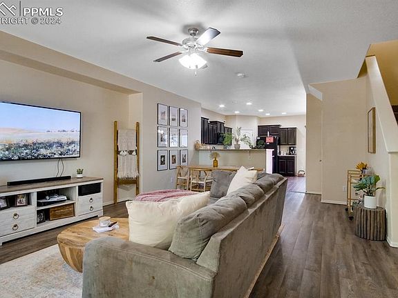 Open and bright townhome in Lorson Ranch. Minutes from Ft. Carson, and in a planned master community with trails and amenities. All front exterior maintenance provided by HOA, while back yard space is just enough for kids/grilling/pets. Upon entry, you are greeted by a large great room, with living and dining nicely complementing one another with matching LVP flooring. Updated kitchen includes a new dishwasher and island. A connecting nook could be used for another eating area, office, or play space for the kids. Upstairs, you will find a spacious master with full ensuite bath and walk in closet, as well as two additional bedrooms. Laundry is also located upstairs. Desirable low maintenance living at your finger tips...