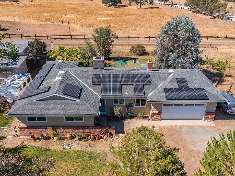 Great horse Ranch in Valley Springs. There is a 16x16 stall with two attached sheds/tack rooms and both have electrical. The barn and the sheds had a new roof put on two years ago. Great pastures and plenty of room for all your toys, two sets of gates and seasonal pond, plus you get a view of all the surrounding hills because the home sits up higher for views! Open floor plan with three bedrooms and two bathrooms. One of the bedrooms is open for a room/office but has a closet. All electric house with a solar lease of $189 per month. New heating and air-conditioning system was put in in 2019. Guest bathroom has a nice Jacuzzi tub with enlarged window so you can take a bath and watch the stars. Master bathroom has a standup shower stall. Master bedroom has two closets. Laminate floors and crown molding throughout, besides bathrooms have linoleum. Peaceful backyard and plenty of fruit trees, including pear, nectarine, avocado, olive, and apricot. New well in 2005 plus 2500-gallon tank. 2022-07-24