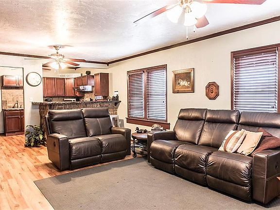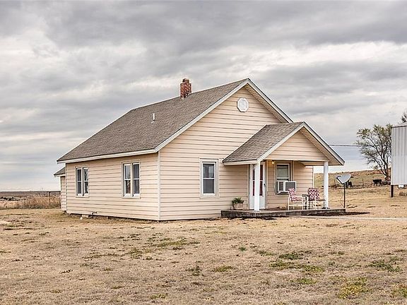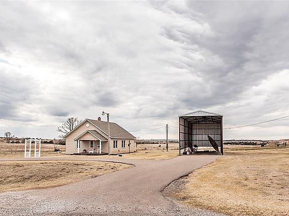 Enjoy country living with neighbors just out of sight! Sweeping views of Western Oklahoma in all directions. This charming 2 bedroom 1 bath bungalow has tons of character. Laminate wood floors and a wood burning rock fireplace in the living room. The kitchen has a stainless appliances. rustic concrete countertops with slate tile backsplash and an eating bar that opens to the living area. Updated kitchen cabinets offer excellent storage. Both bedrooms have nice closet space and plenty of natural light. The laundry room in the back also serves as a mud room and offers additional storage for cleaning and laundry supplies. New hot water heater and water softener. If you have an RV, big truck or big toys, you will love this oversized carport that can easily shelter 4 vehicles, Another metal storage building in back is great for mowers and outdoor equipment. Unwind on the back patio after a busy day & enjoy a great sunset! No restrictive covenants.