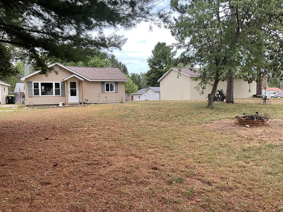Come see this beautiful and large corner lot located in walking distant to town. It has a cute cabin with a 1&1/2 detach garage and also a gigantic 25 X 40 pole barn for all your toys for storage. The house has two bedrooms , one bath and a big family room with gas fire place for entertainment. The Kitchen leaves you with a stove, refri and microwave also dishwasher. Than something most place dont have is a basement with two rooms for more storage.