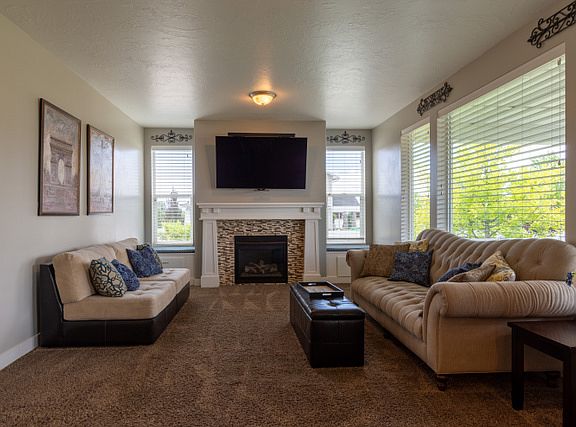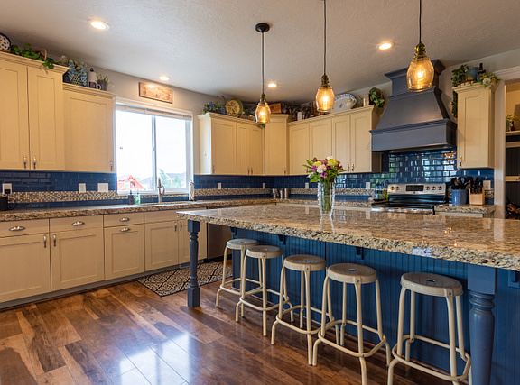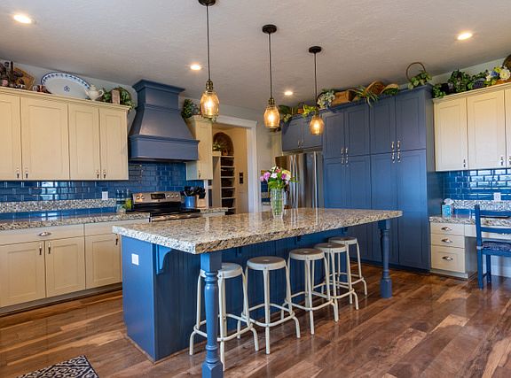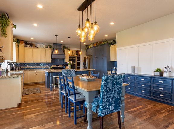 Beautiful home with large, gorgeous yard in excellent neighborhood! Big master bedroom with reading nook, walk-in closet, and private master bathroom featuring dual vanities, oversized tub, and separate shower. Great room with adjoining kitchen including bar-style island and big pantry. Perfect for entertaining: fully finished daylight, walkout basement with full kitchen and large theater room with stadium seating. Incredible yard with something for everyone - big, flat grass space, large, fenced garden area with raised beds and fruit trees, playground and trampoline, gas fire pit, and covered deck and patio!