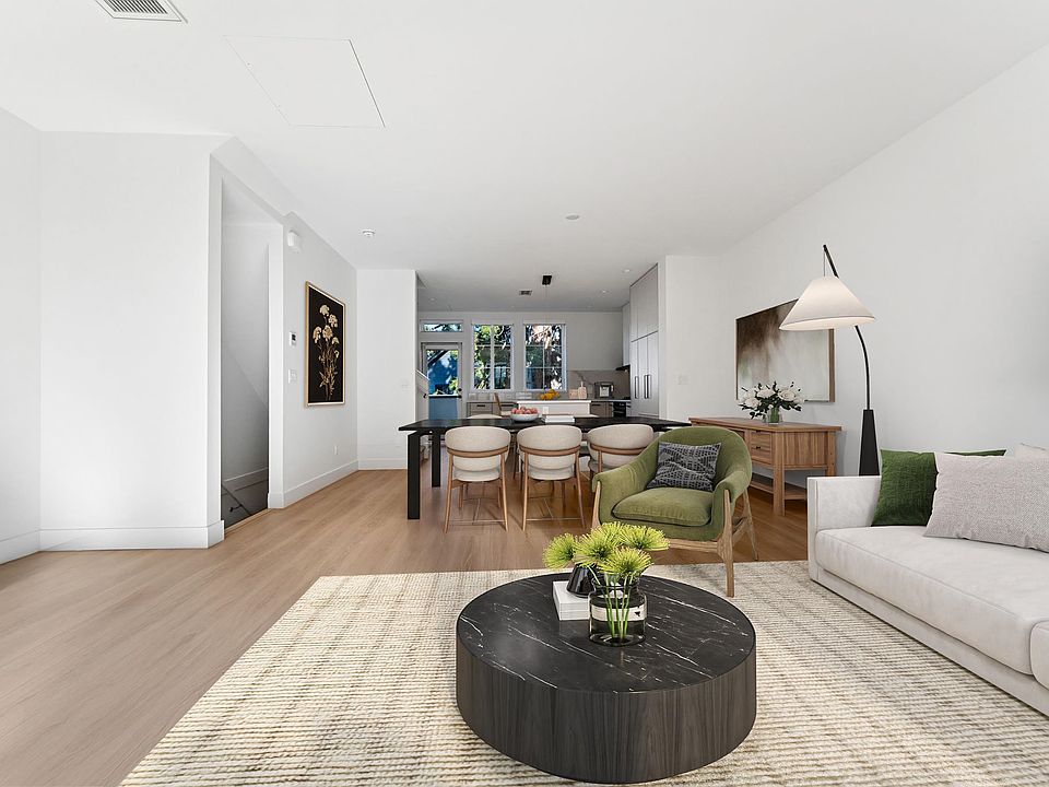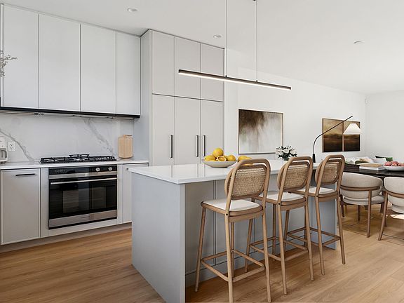 Open-concept kitchenSleek quartz countertopsModern shaker-style cabinetryTwo outdoor areasDeck off the kitchen