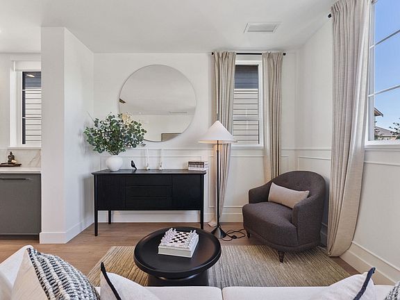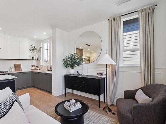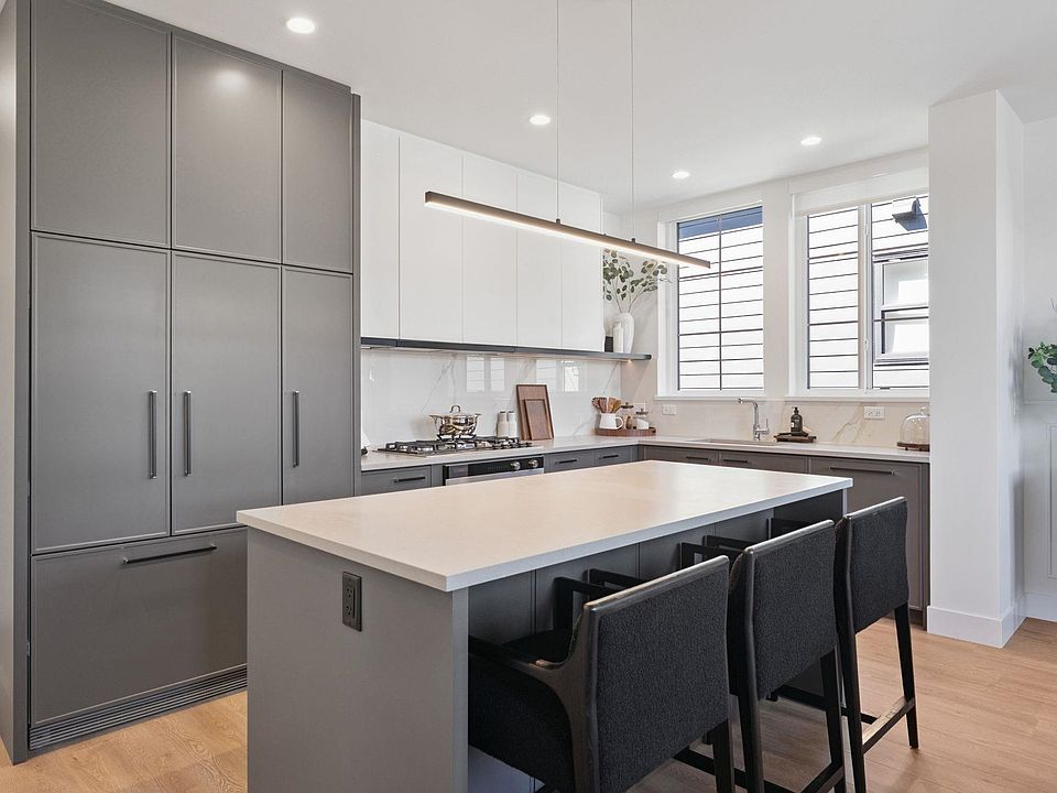 Three levelsModern kitchenSleek quartz countertopsShaker-style cabinetryFenced front patio