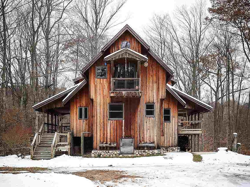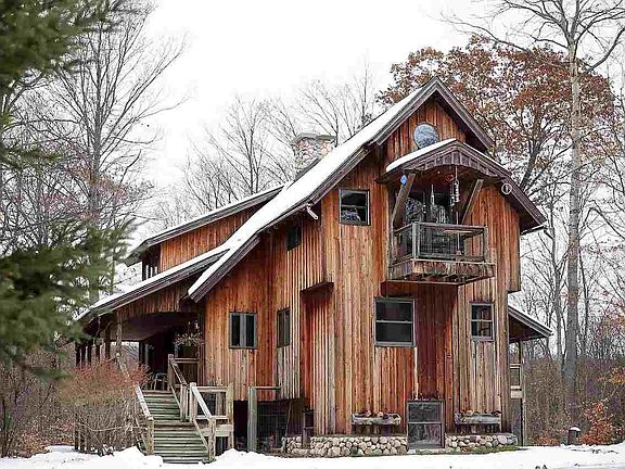 If you're looking for a one of a kind, artisan built, custom home, with privacy and room to roam, you'll want to see this special offering! This incredible property is located on the corner of Gilbert and Bow Roads (Bow Road is a Leelanau County designated scenic road and this section of Gilbert Road is a seasonal road, so think low impact). Dodge Springs, starts uphill and flows gently down the side of Gilbert Road, is part of the Glen Lake Watershed, and greets you at the head of the driveway as you enter and leave this pastoral setting. Scott Gordon, a local tile installation artist has created a fabulous, lodge style home and his work is on display throughout this special place, perched like a tree house on one of the numerous ridge lines on the just over 20 acre site. On the exterior, board and baton siding, accented with local cobble stone accents and chimney, covered porches on the sunrise and sunset sides, complemented with open patio levels, that overlook a peaceful meadow and surrounding hardwood forest. Inside, radiant in-floor heat warms all three levels, the main level features spacious kitchen with all brand new stainless steel appliances, tile floors, and counter tops, ash floors in the dining, living, office and craft rooms, upper level has 3 bedrooms, two that share a full bath, the master suite has its own with a wonderful balcony that overlooks the estate. Lower level has an additional full kitchen and bathroom, living/family room, and potential 4th bedroom or studio space. Detached garage is combined with chicken coop/animal barn, pasture area could be used for livestock, gardening, or play, large wood shed for those who will want to utilize the lower level wood stove, and charming vertical pine log cabin, perfect for overflow company, he/she shed. Just a mile to Glen Lake public access, Burdickville, the Bow Lakes/Sleeping Bear Dunes Lakeshore recreation area, and only 20 minutes to Traverse City. Come see this extraordinary property!