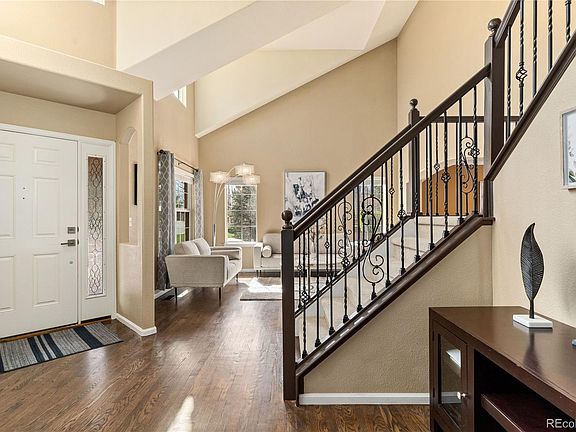 Exquisite Indigo Hills home on a south-facing corner lot with beautiful updates and a finished basement! Step inside the front door and be immediately wowed by the soaring 2-floor ceiling, gorgeous hardwood floors, fresh paint, and brilliant natural light. An entertainer's dream, this gem boasts an open concept family room and eat-in kitchen as well as elegant formal living and dining room. The refreshed kitchen delights with stunning granite countertops, an island, abundant cabinet space, counter seating, updated stainless steel appliances, a built-in desk, a new disposal, a new faucet, and a bayed breakfast nook that opens to the backyard. A cozy gas fireplace anchors the family room that also has an included flat screen TV and another 2-floor vaulted ceiling. The main floor is completed by a bathroom, the laundry room, and a flexible bedroom/office with French doors, built-ins, closet and attached bathroom. A striking open staircase leads to the upper level primary suite that impresses with double door entry, mountain views, a cathedral ceiling, a walk-in closet, and a 5-piece bathroom. Also on the upper level are 2 bedrooms that share a Jack and Jill bathroom and another bedroom with a private en-suite bathroom. More living space awaits in the light-filled finished basement that offers a sprawling rec room, a conforming bedroom, a flexible space, and another bathroom. Additional upgrades include a 3-car insulated garage, an updated furnace, and an updated AC. Soak up all 300 days of Colorado's sunshine from the large fenced backyard that features deck, spacious patio, a shed, and mature trees. Wonderful location in a quiet neighborhood 2 blocks from Saddle Ranch Elementary and a few more blocks to miles of trails, parks Ranch View Middle, and Thunder Ridge High. Relish quick access to shopping, dining, Highland Ranch's fantastic rec centers, the Indigo Ranch community pool, and all of life's conveniences. HOA shovels snow from the sidewalk on Royal Eagle Rd.