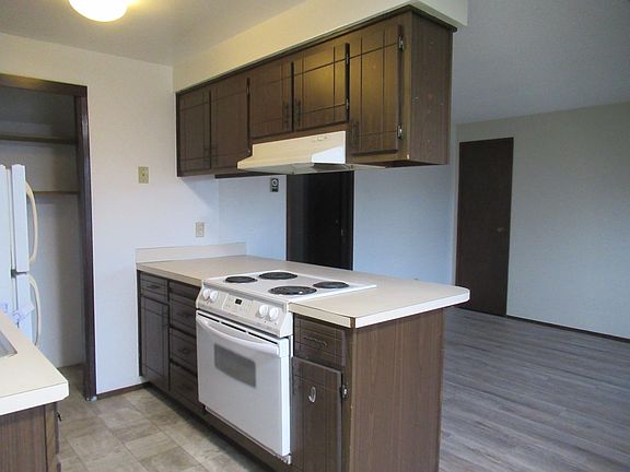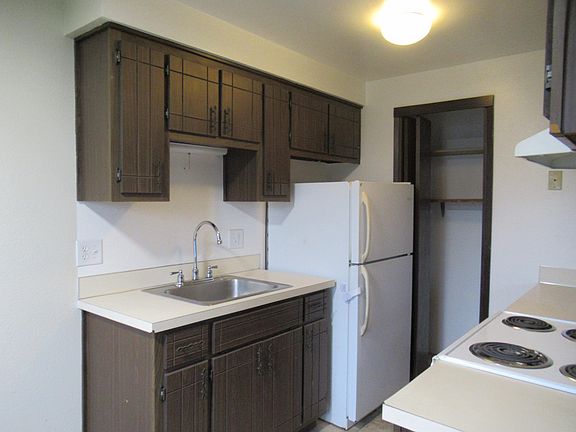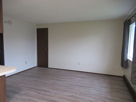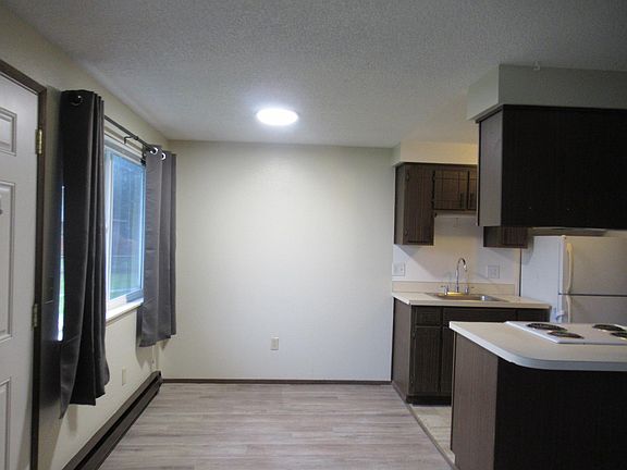 Centrally located downstairs end unit. 1 bedroom, 1 bath. Range, refrigerator. Coin-op laundry on premises. Electric heat. No smoke/no pets. Water, sewer, garbage and yard care paid.