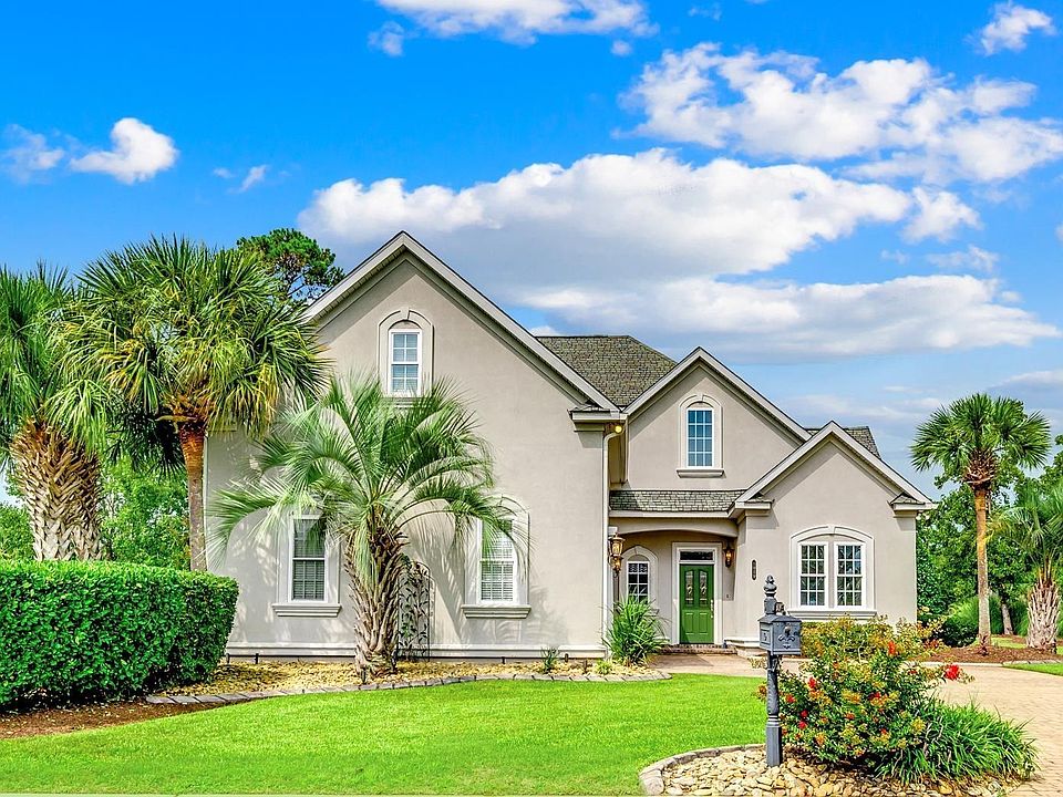 Come venture into this lovely custom-built Mediterranean style home located in the exclusive gated community of The Bluffs on the Waterway! This one-of-a-kind estate sits on a corner lot with a remarkable view of the pond with a water fountain. As you take a journey inside, you will notice elegant hardwood flooring along with high smooth ceilings, crown molding, and french doors that lead into an office. This space could also be used as a craft room or a 4th bedroom downstairs. This delightful home has an open floor plan with a bar along with a propane fireplace. The tall windows provide an abundance of natural light and the breakfast nook is the perfect place to enjoy your favorite beverage in front of the bay window. The large kitchen features stainless steel appliances along with granite countertops, a pantry, and an island for extra space. The formal dining room has a tray ceiling and it's the ideal spot to host dinner parties. There is a powder room downstairs for guests along with a full-size laundry room. All the window treatments shall convey. The massive owner's suite is located on the first floor, and you can enjoy the enchanting water view from bed. There's a private door that leads outside along with an adjoining bath with a ceramic tile shower, jetted tub, dual vanities, and a big walk-in closet. As you go upstairs, you will find a sitting area along with a huge bonus room, which can be used as a bedroom, fitness area, game room, or even a home theatre. There is a guest room located upstairs as well with a walk-in closet and a bathroom with separate vanities and a whirlpool tub. This stunning home has been very well maintained by the original owner and she's even offering a warranty for extra piece of mind. The HVAC for the main level was replaced about 3 years ago with a Trane system and a Rheem hot water heater was added approx. 4 years ago. This move-in-ready home has been freshly painted, professionally cleaned, and the landscaping was recently rejuvenated. The veranda is absolutely gorgeous and it's the perfect place for entertaining. You can grill out with friends and enjoy the serene water view. The oversized garage will fit two cars plus a golf cart and motorcycles are allowed in this community. There is an irrigation system as well. The Bluffs has two extraordinary clubhouses and parking areas for boats. There is a boat ramp and a day dock. You can take a dip in the resort-size pool or you can sit back in the lounge area overlooking the Intracoastal Waterway. This community does have a tennis court and new pickleball courts are being added. The Bluffs is super close to everything that the Grand Strand has to offer! The Golden Mile beach is only a few minutes away along with several top-notch golf courses, delicious restaurants, and places to shop. This exquisite home is located in the award-winning Carolina Forest school district. This is truly a rare find and you don't want to miss out! Schedule your showing today and don't forget to check out the virtual tour! Square footage is approximate and not guaranteed. Buyer is responsible for verification.