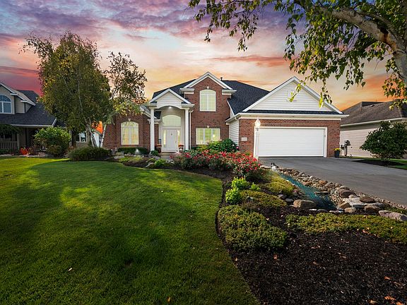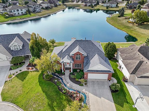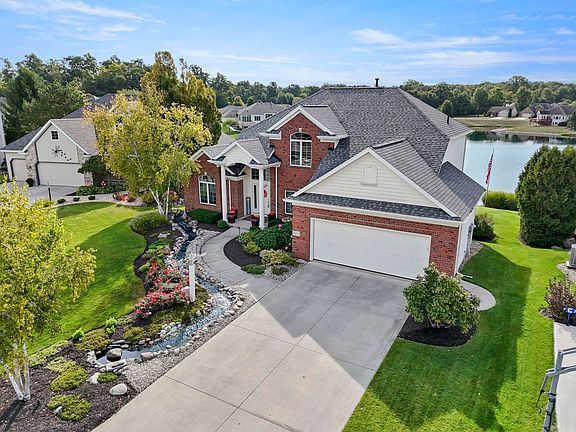This custom built home on a spectacular water lot and cul-de-sac awaits you! Stunning curb appeal with brick facade, and professionally landscaped on 4 sides PLUS 9 zone irrigation. New shingles 2022. Custom composite deck (2017) with unique wire and column railing and retractable awning add to the appeal. Treated garage floors with drains and extra attic storage. Enter the impeccably maintained, open 2 story foyer with ample dining and cozy family room. Relax in the trey ceiling, oversized master with new en-suite bathroom that includes Cambria counters and beautiful tiled Roman shower. You will appreciate the ample cabinetry with granite, stone backsplash, pantry and stainless appliances. Two additional bedrooms and loft area in the upper level. Last, but certainly not least is the outstanding daylight, finished lower level complete with luxury vinyl plank flooring, 4th bedroom, full bath, exercise room, 2nd family space with plenty of room for game table or billiards and huge storage room. HVAC system 2017. Convenient walk in floored attic.