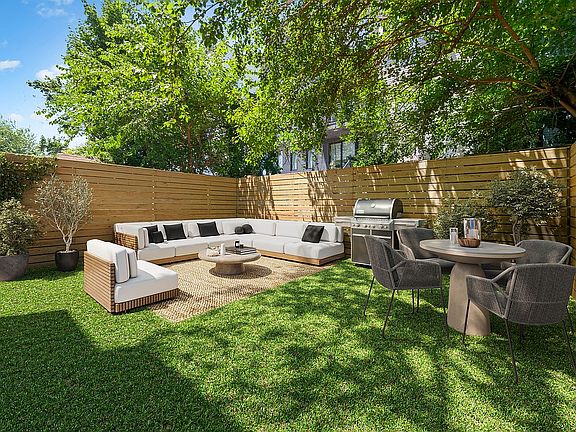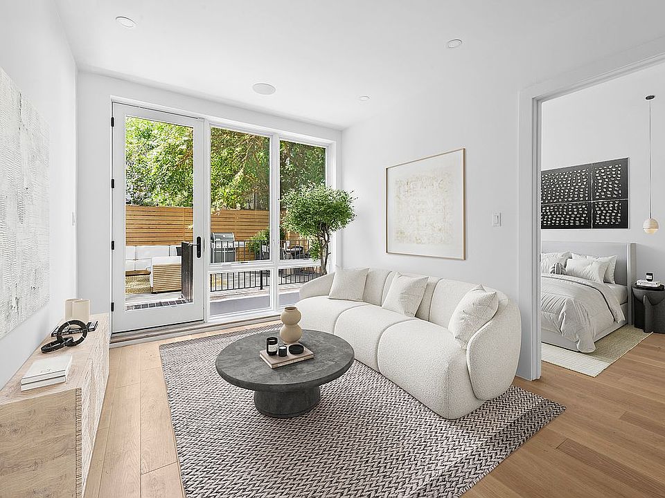 The townhouse is a spacious 2-bedroom, 2.5-bathroom duplex with 1,238 interior square feet and 836 square feet of private outdoor space across two separate areas. The upper level features a bright living and dining area with oversized windows and sliding glass doors that open to a northern-facing garden that spans 719 square feet. The chef’s kitchen is beautifully designed with a Bertazzoni gas stove, custom cabinetry, and a large island with seating for four, a functional centerpiece ideal for both cooking and entertaining.