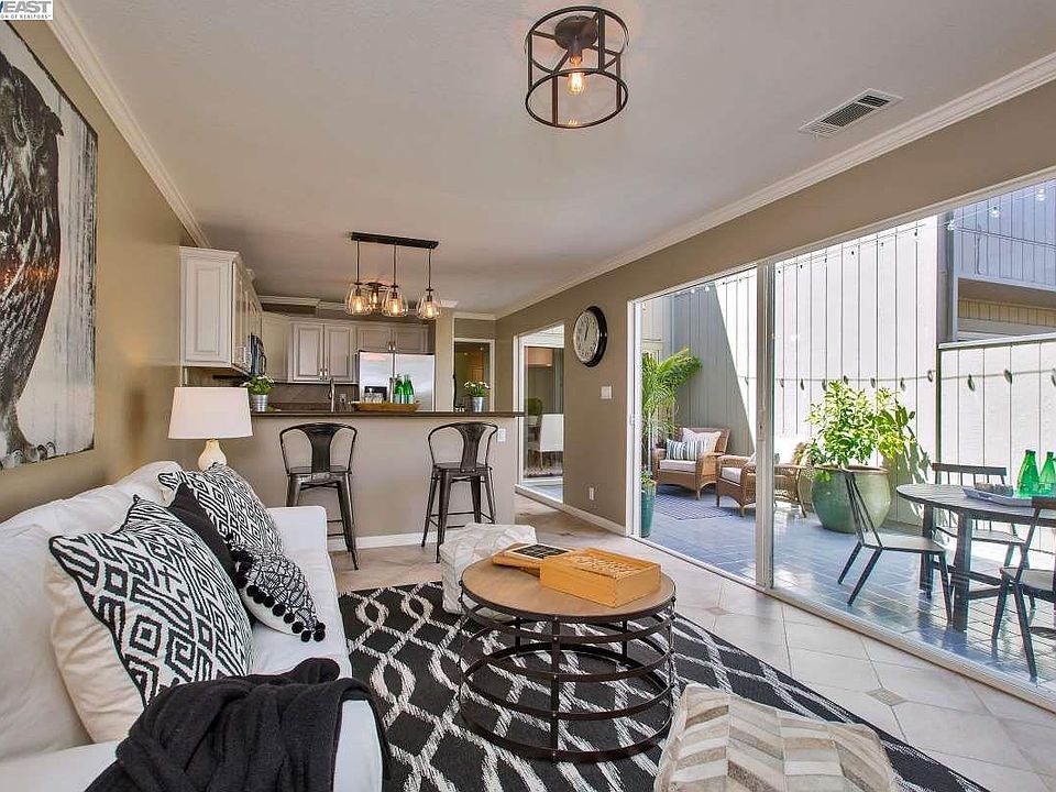 Beautifully updated, and rarely available, H-Model townhome in Bay Farm Island's Garden Isle, close to top performing schools, lagoon & bay trails & facing out to nearly one acre of green space, lit walkways, community pool & clubhouse. This spacious & sophisticated home features an exterior courtyard with access from both the dining room & kitchen, making outdoor entertaining a breeze. The large, eat-in kitchen has enough space for a family room or casual eating area. The second-floor bonus space is perfect for a family room, home office or library. Updates include granite counters in kitchen & bathrooms, engineered hardwood floors in living & dining rooms, ceramic tiles on kitchen floor & backsplash, stainless steel appliances, including a gas range, new Berber-style carpeting on second level, fresh paint, & new, contemporary lighting. Easy access to shoreline & lagoon walking trails, top schools, shopping & restaurants, SF Ferry, BART, I-880 & Oakland International Airport.