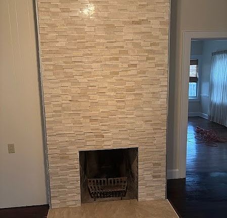 Freshly paintedRefreshed living spaceMarble backsplashWoodburning mosaic tiled fireplace