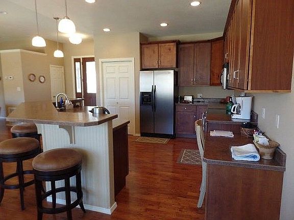 . This is a lovely 2 bedroom, 2 bath town house. The spacious great room living area has extra high ceilings, large windows with beautiful views of mountains and Salmon River cliffs and lovely hardwood floors. A cozy propane fireplace adds ambiance and warmth. A nice feature in the living room is the large glass-doored built-in cabinet which provides the perfect place for your TV. Roomy kitchen has plenty of counter space and lots of solid wood cabinets, large panty and breakfast bar. High quality stainless steel kitchen appliances included. Recessed lighting in kitchen, hanging lights above the bar and dining area together with large picture windows create plenty of light day or night. The master bedroom has private views, large on-suite bathroom w/tiled shower & glass doors, two separate sinks, heated floors and large walk-in closet. The second bedroom is spacious and the adjacent guest bath has tile shower w/glass doors. Laundry room includes like-new washer and dryer. Attached, double car garage has coated concrete floor, 2 closets & elec. garage door. Fully landscaped front & back w/service available, fenced back yard, concrete drive & sidewalks make for low maintenance. Call 208-303-7423 to take a look