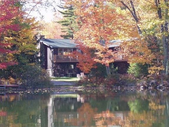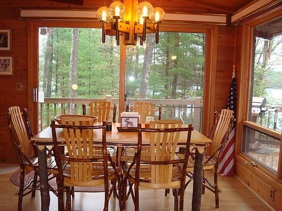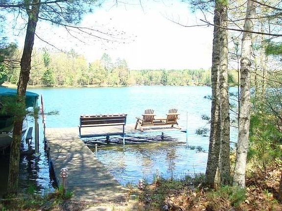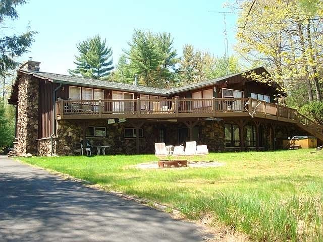 "Upper Kaubashine Lk, one of the best kept secrets on the quiet side of the N'Woods. PRIVATE LK, crystal clear, deep and superb fishing." Large home sitting on a peninsula point which boasts 180 degrees of lake views. A private boat launch with a level approach to the sand frontage. The pier and lake pump are included. Extras include a nicely treed lot for privacy, a black top driveway and an extra detached garage. Entertain on the lakeside deck that runs the entire length of the home while taking in the views of both woods and water. Inside features include a beautiful wall of stone-work and a wet bar with seating for 9 in the great room, lakeside windows that run the length of the home, Northwoods appeal with knotty pine walls/ceilings, 2 fireplaces with beautiful stonework, plus a free standing stove. There is an alarm system and a hottub also included. This home has plenty of room, so bring your friends and family!
