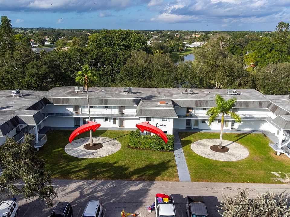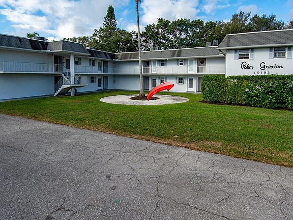 Remodeled 2 bedroom, 2 bath waterfront condo in Palm Garden Condos overlooking the Earman River! Updated kitchen with wood cabinets, granite, and stainless steel appliances (over is a double oven). 24'' tile in main areas and wood laminate floors in both bedrooms. Both baths updated. Accordion shutters on all windows. Fresh interior paint throughout. Split floor plan. Washer and Dryer inside the unit in hall closet (as well as in the building). Screened-in patio with tile overlooking the canal. The AC was replaced in 2018, water heater in 2019, and a new main water line was installed in 2022. Lots of wildlife and mature oak trees. Central location, close to shopping and highways. Amenities include clubhouse and pool.